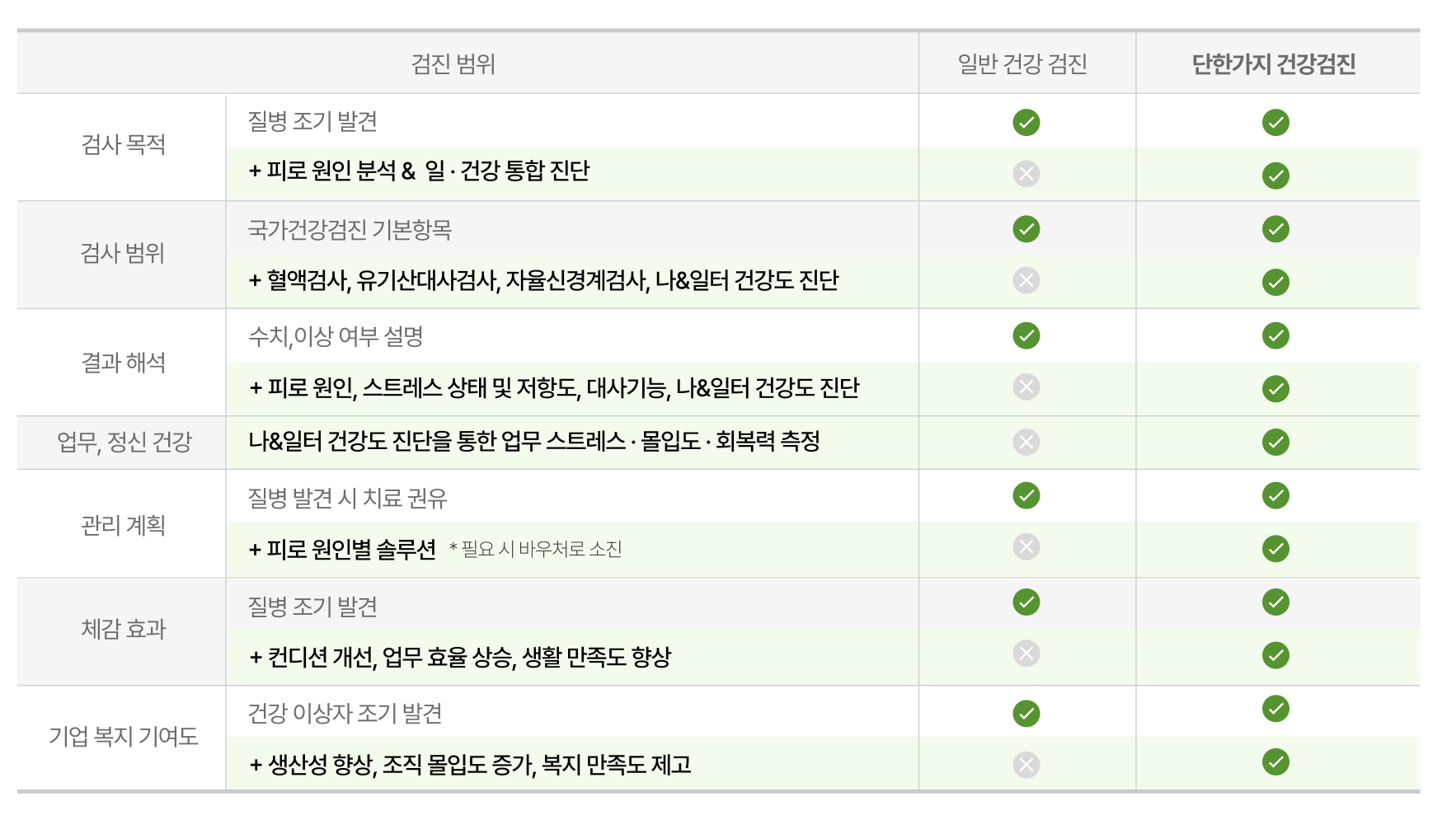 정기검진이 ‘질병 여부’만 확인한다면, 단한가지의원의 직장인 특화 검진 프로그램은 당장의 컨디션·에너지·회복력을 수치로 보여주는 실용적인 건강검진입니다.
