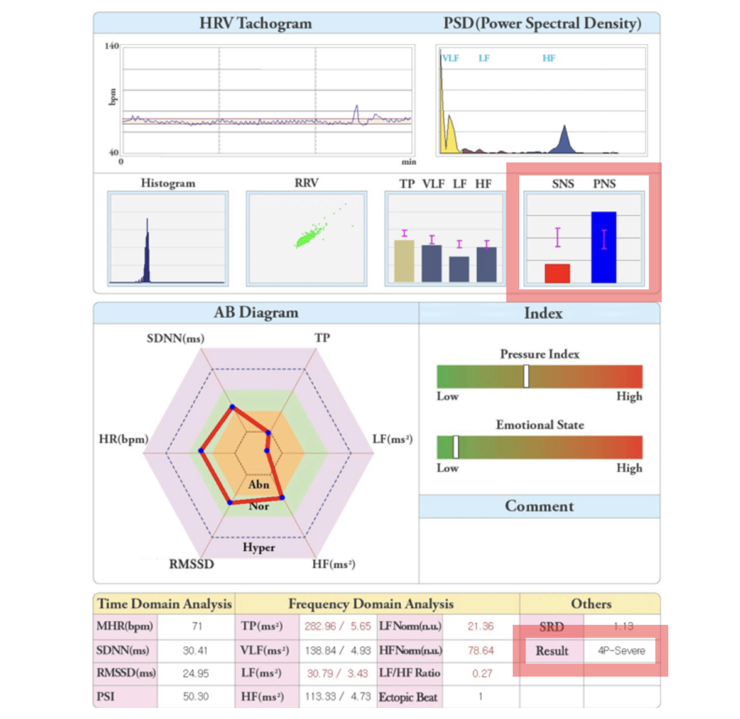 자율신경계 중 교감은 스트레스 상황에서 긴장도를 높여주는 역할을 하고, 부교감은 스트레스 상황 이후 긴장도를 낮춰주는 역할을 해요. 특히 교감신경 수치가 또래에 비해 많이 낮게 나왔습니다. 교감신경은 스트레스 상황에서 우리 몸이 반응하게 도와주지만, 너무 오래 높은 상태가 지속되면 고갈될 수 있어요.